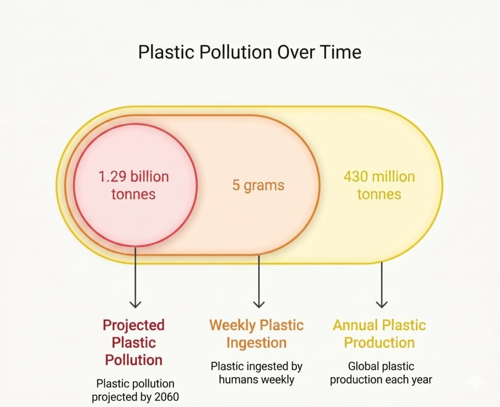 If no action is taken, plastic pollution is projected to triple by 2060. According to a 2019 Reuters infographic, an average human ingests about 5 grams of plastic every week.
